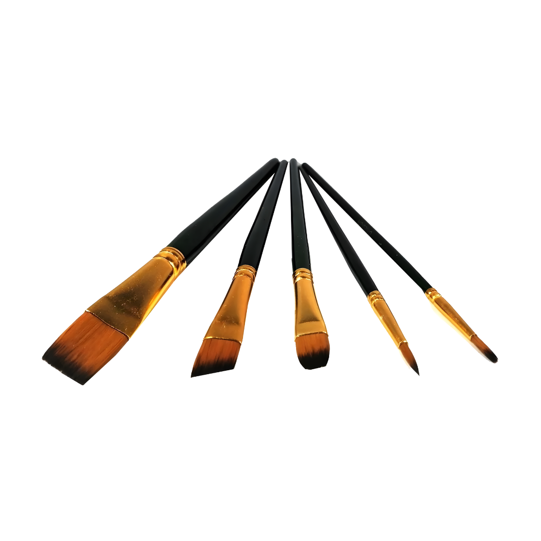 Set de 5 pinceles con mango en goma que facilita agarre cómodo durante uso prolongado.