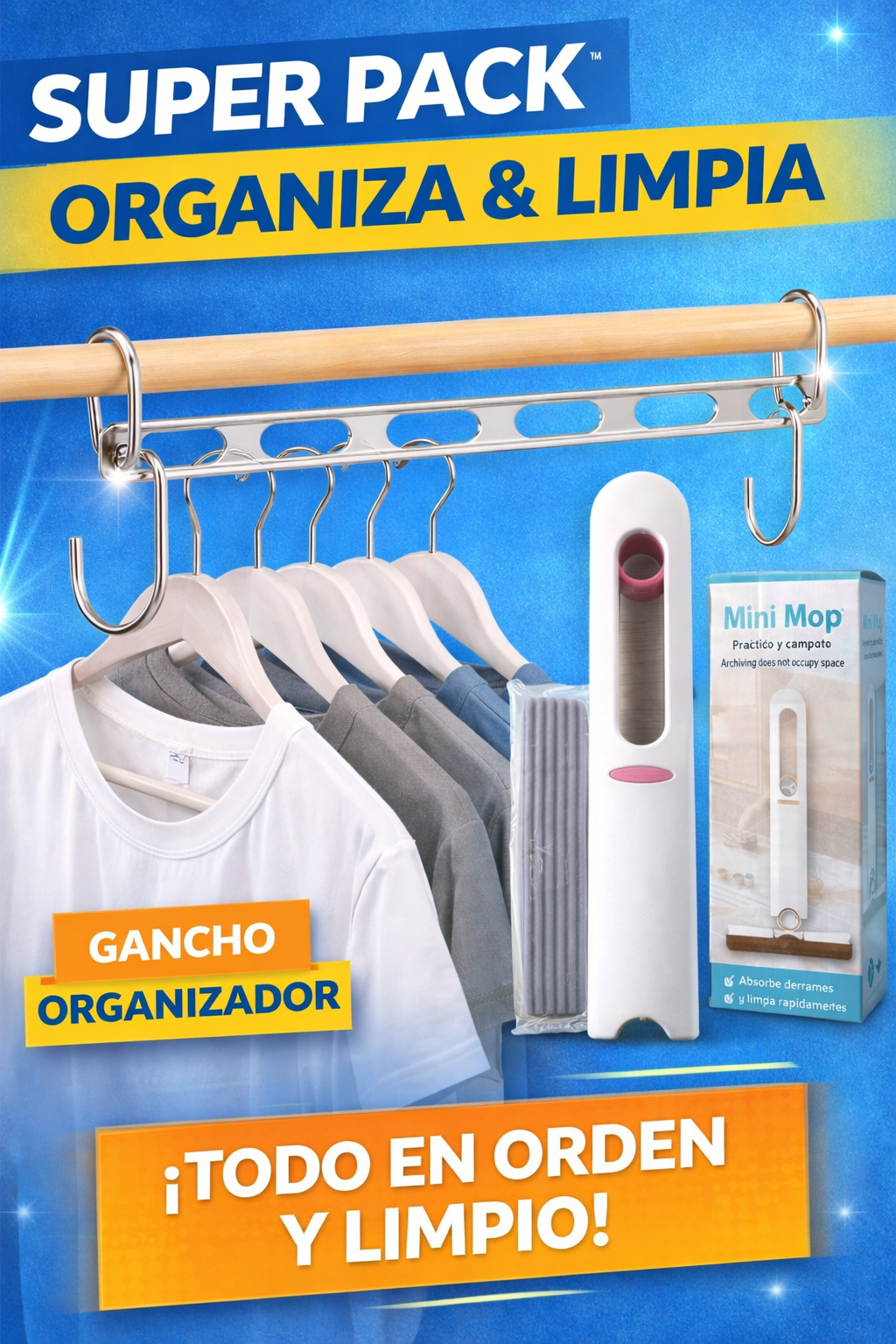 Transforma tu hogar con este práctico combo diseñado para hacer tu vida más fácil. Incluye un gancho organizador multifuncional ideal para maximizar el espacio en tu clóset y un mini trapeador absorbente perfecto para limpiezas rápidas en cualquier momento.