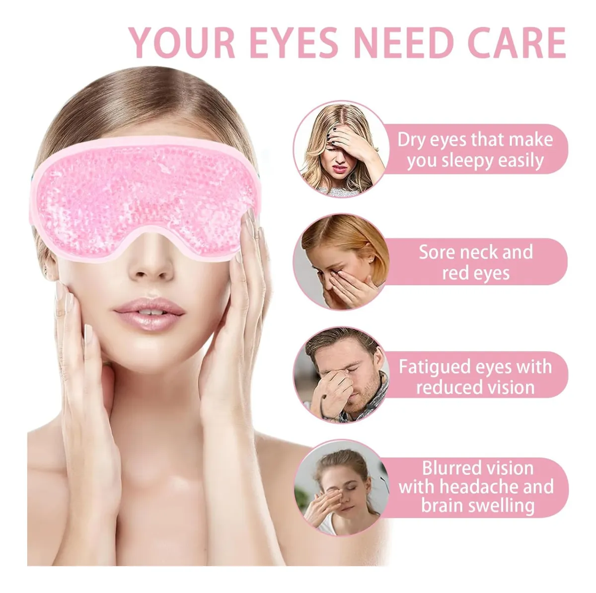 Nuestra máscara de gel refrescante para ojos está diseñada para brindarte alivio inmediato y una experiencia de relajación total. Ideal para tratar migrañas, ojos hinchados, fatiga ocular, dolores de cabeza o estrés, gracias a su tecnología de microesferas de gel flexible que conserva la temperatura por más tiempo. Beneficios: •Terapia de frío: Reduce inflamación, ojos hinchados, alergias y ojeras. •Terapia de calor: Relaja los músculos, alivia dolores de cabeza y mejora la circulación. •Diseño cómodo y flexible: Se adapta a cualquier rostro gracias a su correa elástica ajustable. •Segura y duradera: Hecha de PVC resistente, con gel no tóxico y libre de BPA. •Uso versátil: Perfecta para dormir mejor, aliviar migrañas o simplemente relajarte después de un día agotador.
