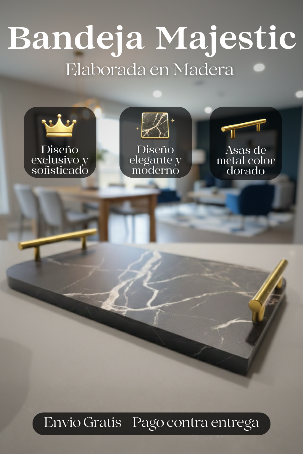 Bandeja decorativa elaborada en tablero aglomerado melamínico de alta calidad, diseñada para aportar elegancia, organización y funcionalidad a cualquier espacio del hogar u oficina.