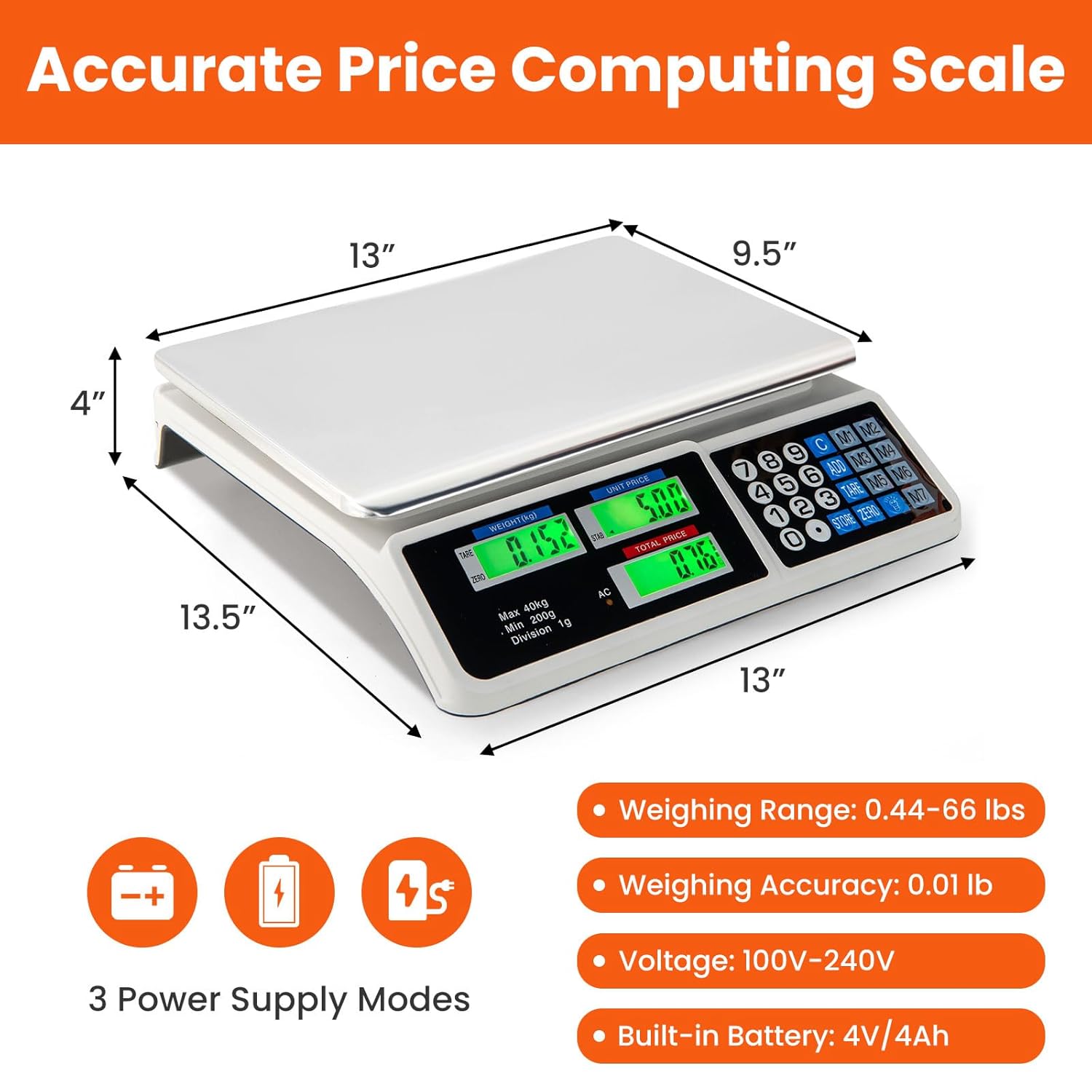 Báscula Digital Comercial 40 kg para Alimentos y Carne, Plataforma de Acero Inoxidable, Pantalla LCD Doble con Luz Verde, Función de Precio y Cálculo de Cambio, Ideal para Mercado, Tienda y carnicerías