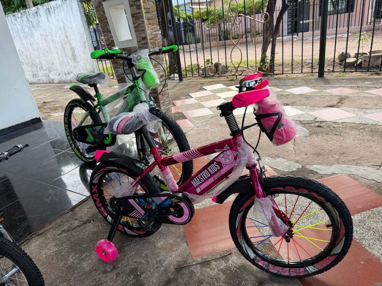 Diseño: colores rosado/fucsia con gráficos infantiles; radios de colores decorativos en ambas ruedas.