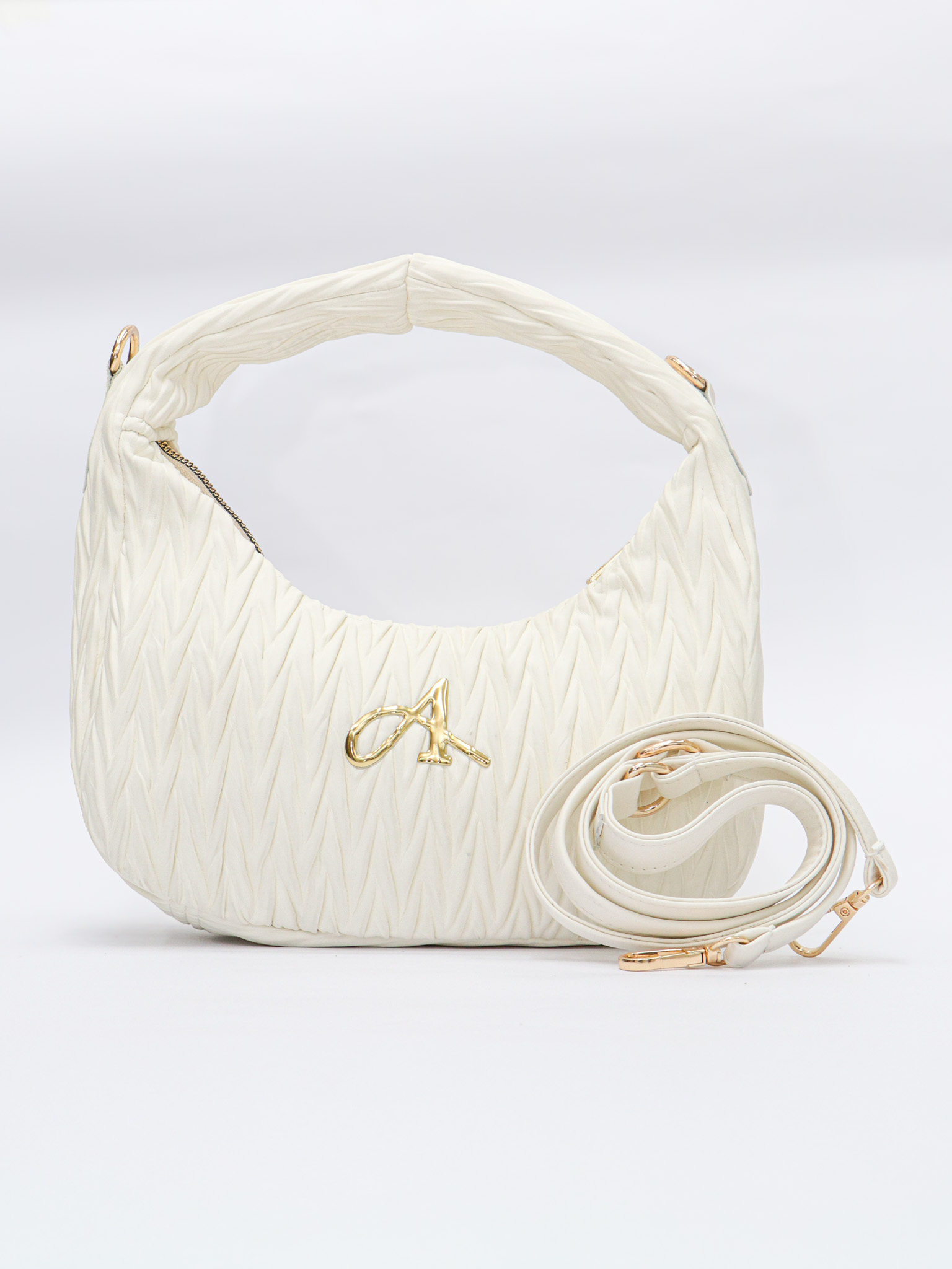Este bolso es un modelo pequeño tipo hobo, con una silueta curva y compacta que se lleva al hombro o en la mano 👜✨