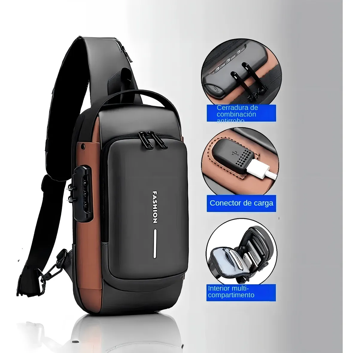 **Bolso Manos Libres Mini Morral Hombre Tipo Pechera Antirrobo** **Características Principales:** Diseño de Puerto de Carga USB: La conveniencia se encuentra en la punta de tus dedos. Nuestro bolso de pecho cuenta con un diseño de puerto de carga USB para mantener tus dispositivos cargados en movimiento. Seguridad Antirrobo: Tu tranquilidad es importante. Hemos incorporado un bloqueo de código de tres dígitos en la cremallera principal para proteger tus pertenencias. Diseño Inteligente de Múltiples Bolsillos: Mantén tus pertenencias organizadas. Nuestra bolsa incluye varios bolsillos, incluido un bolsillo frontal con cremallera, un bolsillo trasero seguro y compartimentos especiales para tabletas, teléfonos móviles, billeteras, pasaportes y más. Tela Impermeable: Enfrenta el clima con confianza. Nuestra tela repelente al agua protege tus pertenencias de las salpicaduras. Usos Versátiles: Ya sea para el trabajo, viajes, actividades al aire libre o tu rutina diaria, esta bolsa de pecho es elegante, liviana y funcional.