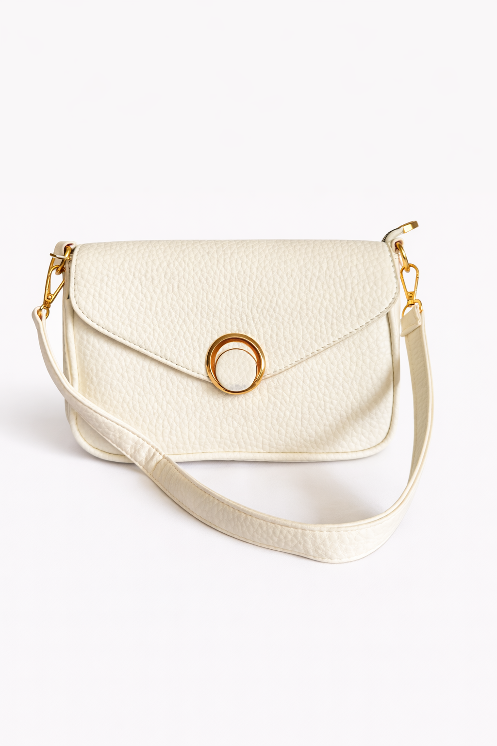 El verdadero protagonista de este diseño es su amplia tapa frontal, que se cierra elegantemente con un herraje central metálico distintivo, añadiendo un punto focal de lujo instantáneo a cualquier outfit, desde unos jeans casuales hasta un vestido de noche.