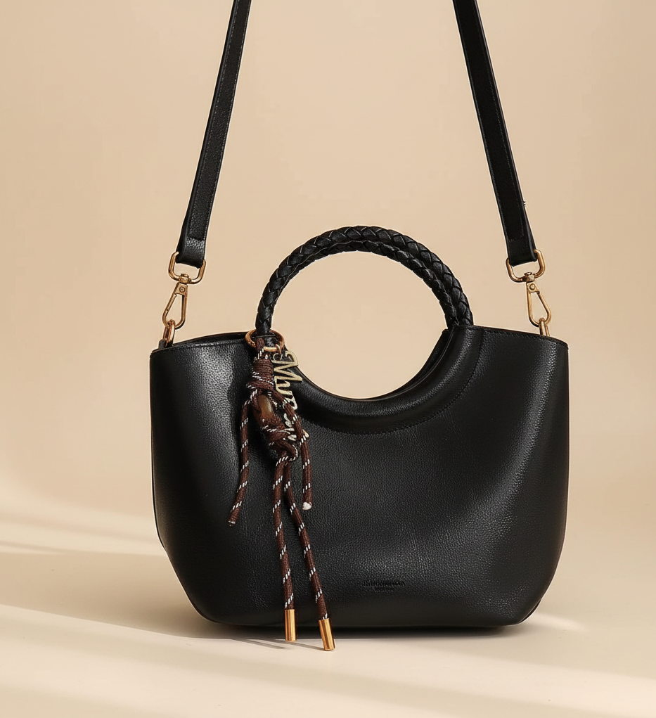 Asa Circular Trenzada: El punto focal del diseño es su asa rígida con acabado trenzado a mano, que ofrece un contraste de textura sofisticado y un agarre de lujo.