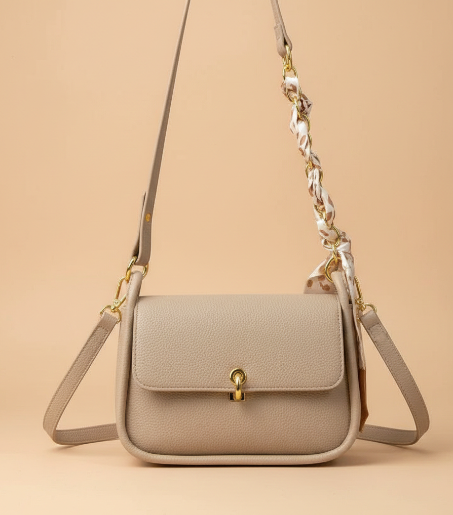 Este bolso tipo bandolera redefine el concepto de "básico elegante". Su diseño de líneas suaves y estructura compacta se complementa con un detalle de pañuelo entrelazado en la cargadera, aportando un aire femenino y vanguardista que lo convierte en el protagonista de cualquier look.
