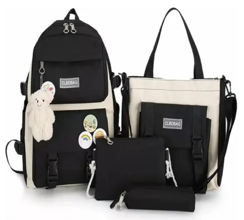 CARACTERISTICAS -Kit completo para estudiantes. -Maleta espaciosa para cuadernos y libros. -Bolso de mano elegante y funcional. -Bolsos pequeños para organizar lápices y accesorios. -Peluche de oso colgando para personalizar tu estilo. -Diseño juvenil y moderno. -Material duradero y de alta calidad. -Correas ajustables para mayor comodidad. -Variedad de compartimentos para una mejor organización. -Ideal para uso escolar, universitario o diario.