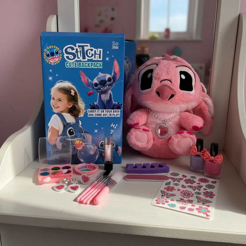 ¡El regalo ideal para niñas! Este hermoso set combina diversión, ternura y creatividad. Incluye una mochila temática de Stitch, un suave peluche rosado tipo Ángel, y un completo kit de maquillaje infantil seguro para jugar.