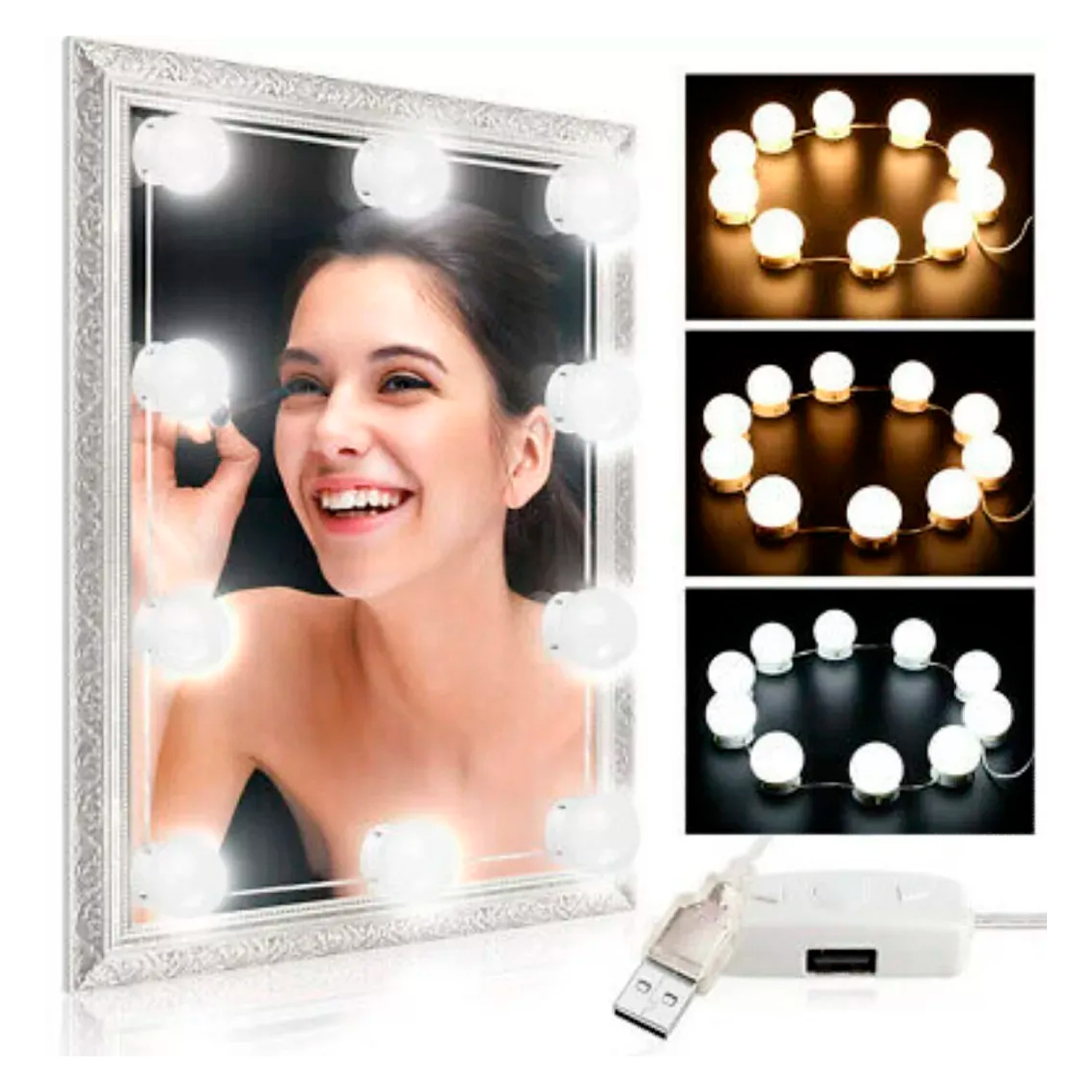 Aquí tienes algunas características comunes de un “bombillo tocador x10 mts TR”, que normalmente se refiere a kits de luces LED para espejo de tocador con 10 bombillas (también conocidas como luces estilo Hollywood o vanity mirror), usados para maquillaje, aseo y buena iluminación frontal: 🔦 Características típicas de un kit de bombillos de tocador 💡 Iluminación LED: Utilizan tecnología LED, que ofrece luz suave, eficiente y de bajo consumo. 🔌 Alimentación: Se pueden alimentar generalmente por USB (5 V), lo que significa que puedes conectarlos a un adaptador de pared, power bank o computadora. 🌈 Temperatura y modos de luz: Suelen ofrecer varias temperaturas de color (blanco cálido, neutro y frío) o modo ajustable según la versión. 🔆 Regulable: Muchos kits tienen brillo ajustable (varios niveles o continuo) para adaptar la iluminación a tus necesidades. 📏 Número de bombillas y distancia: Incluyen 10 bombillas LED conectadas por cable, con una separación ajustable entre cada foco para adaptarse al tamaño del espejo. 📍 Instalación simple: Se adhieren al espejo o superficie con cinta adhesiva de doble cara o ventosas incluidas. 👁️🗨️ Uso principal: Ideales para maquillaje, afeitado, selfies o mejorar la iluminación de tu tocador o espejo.