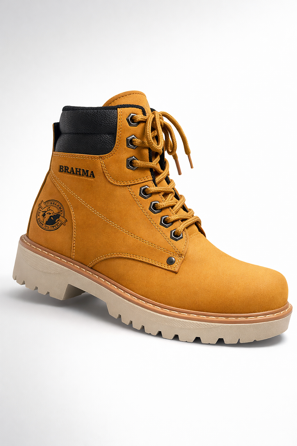 Esta bota de trabajo de la marca Brahma destaca por su diseño resistente y estilo clásico tipo industrial. Está fabricada en cuero sintético color caramelo/trigo que le da un aspecto robusto y moderno. Cuenta con cordones frontales reforzados con ojales metálicos para un ajuste firme y seguro.