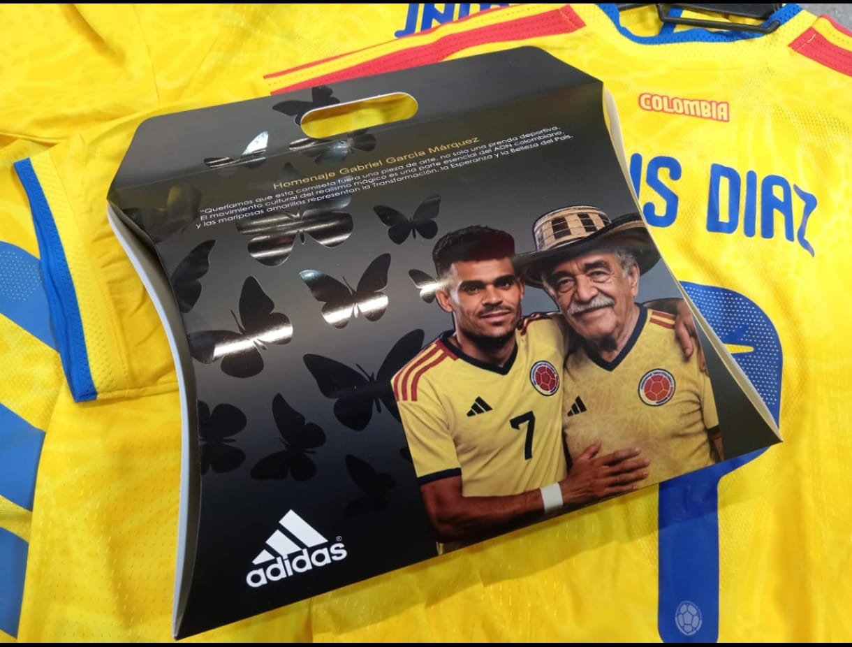 La caja es un homenaje a Gabriel García Márquez, con un diseño elegante en tonos oscuros y mariposas amarillas que revolotean sutilmente. En la parte inferior, una imagen conmovedora de Gabo y un futbolista colombiano sonríen, vistiendo la camiseta amarilla de la selección.