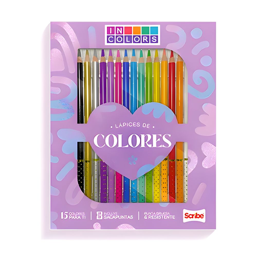 Las imagenes son referencias y pueden variar segun disponibilidad. Esta caja de colores Scribe unipunta Incolors incluye 15 unidades en presentacion tono lila, diseñada para actividades escolares, dibujo y colorear con aplicacion uniforme sobre el papel. Su estructura permite trazos estables y manejo practico en cuadernos, laminas y trabajos academicos.