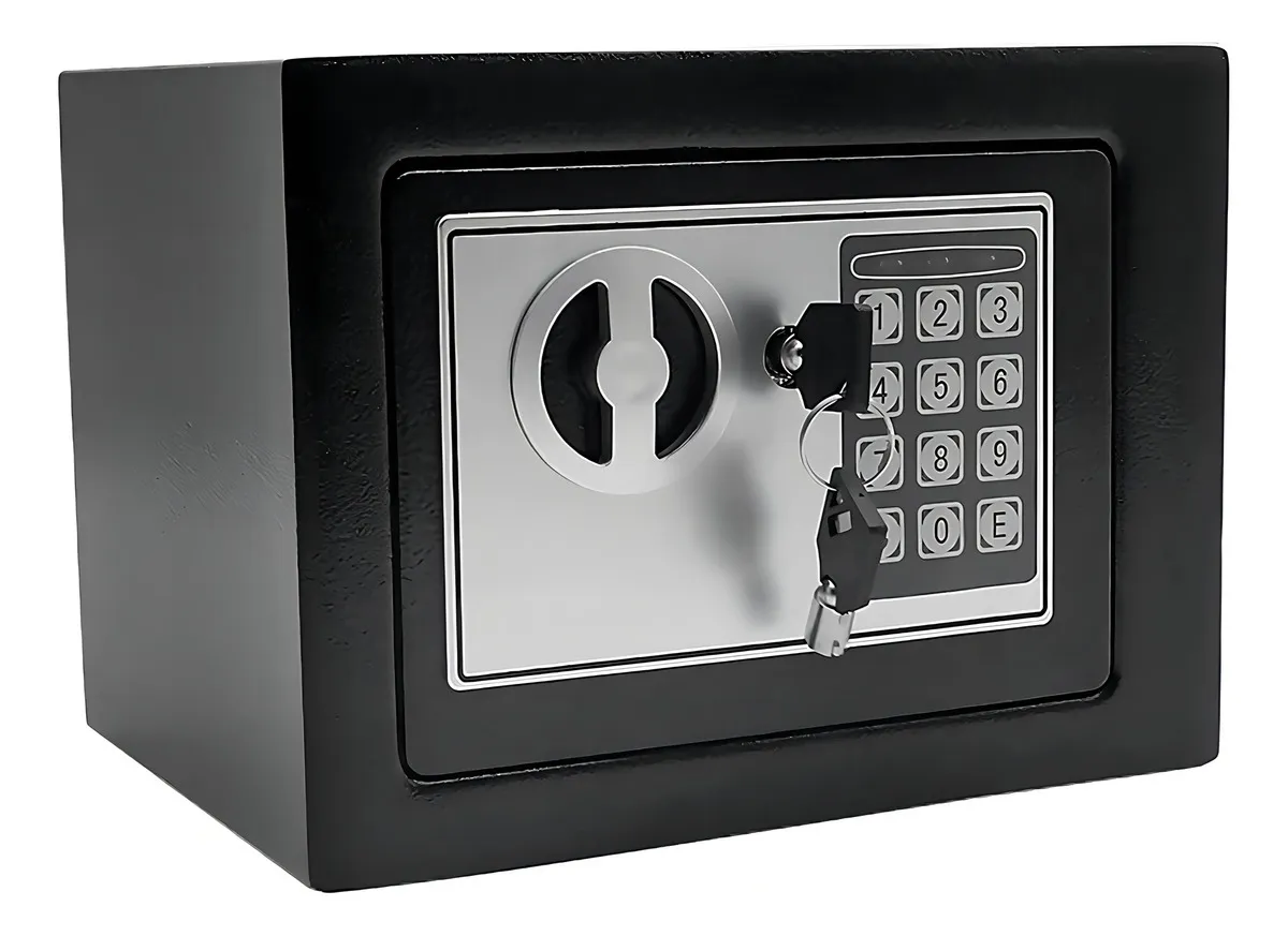 Fabricada con material metálico de alta resistencia, esta caja fuerte ofrece una protección confiable contra accesos no autorizados. Su diseño compacto permite colocarla fácilmente en armarios, escritorios o espacios discretos.