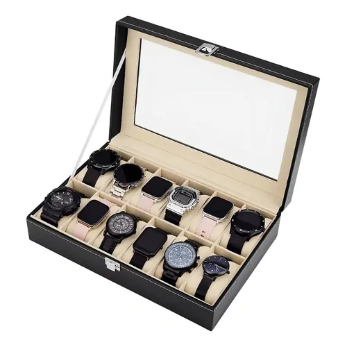Su interior está forrado con material suave tipo terciopelo, que protege los relojes de rayones y daños. Además, su tapa con vidrio transparente permite ver fácilmente la colección sin necesidad de abrir la caja.
