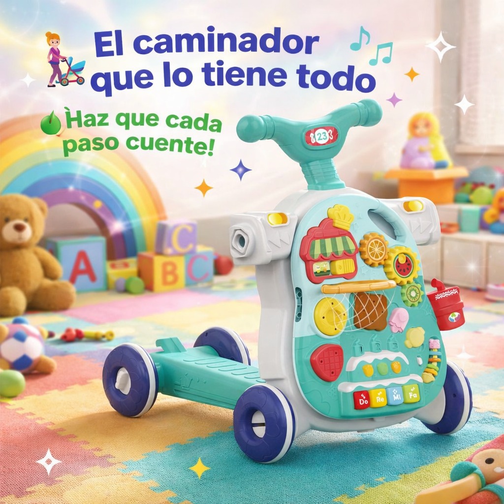 Diseñado como centro de actividades educativo, combina juego, aprendizaje y movimiento en un solo producto. Su panel interactivo desmontable incluye engranajes, botones, sonidos, figuras y actividades que estimulan la motricidad fina, coordinación mano-ojo y desarrollo cognitivo.