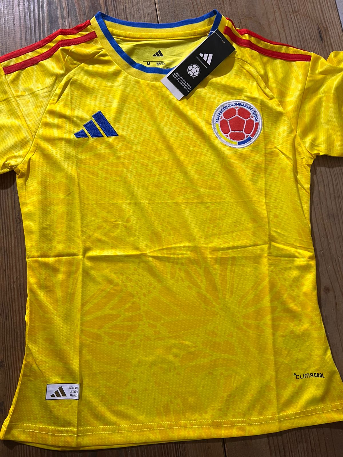 Escudo y logo: incorpora el escudo oficial de la Selección Colombiana en el pecho junto con el logo de adidas, aunque en una versión más simple y accesible que la camiseta de jugador.