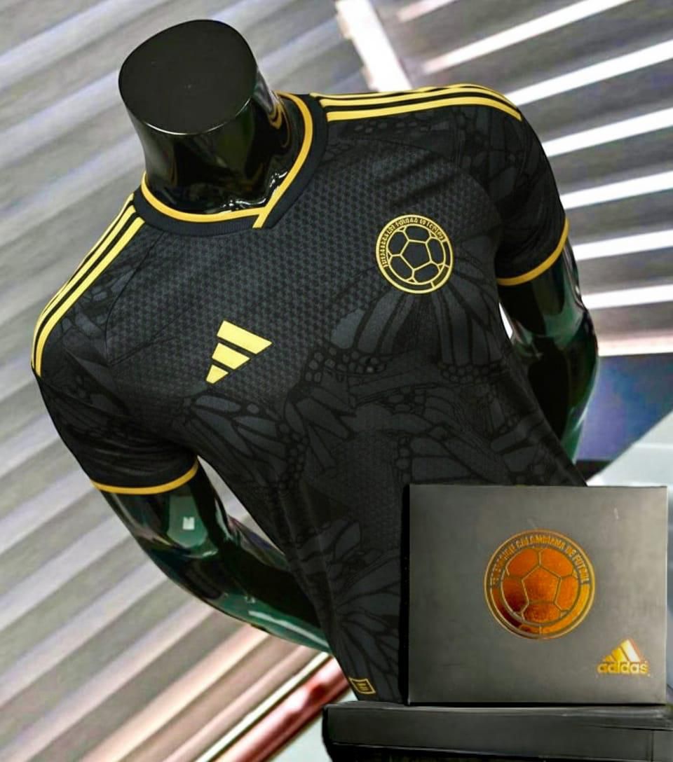Luce con orgullo esta espectacular camiseta de Colombia 2026 en elegante color negro con detalles dorados que representan poder, grandeza y pasión por el fútbol. Su diseño exclusivo incorpora un sutil patrón de mariposas inspirado en la riqueza cultural del país, aportando un estilo único y sofisticado.