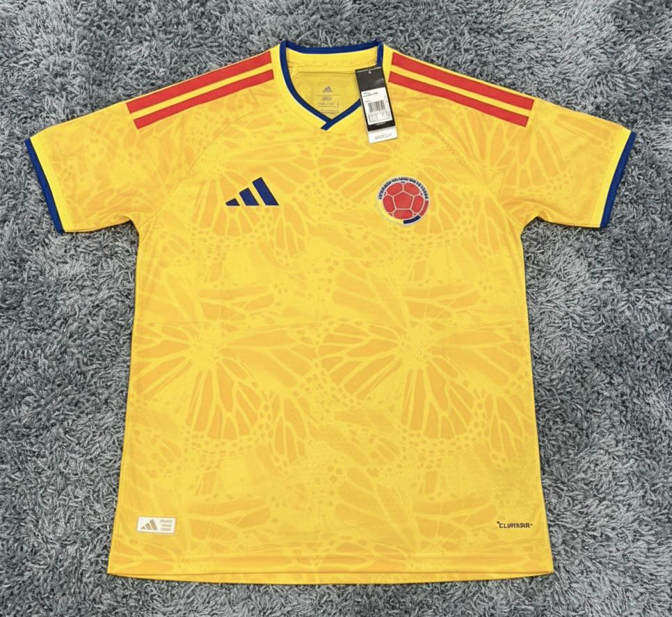 CAMISETA DE SELECCION COLOMBIA PARA MUNDIAL 2026 COLOR AMARILLO CALIDAD 1.1, VERSION JUGADOR, TELA MICROPERFORDA CONTEXTURA DE MARIPOSA V CON SUS LOGOS ENCAUCHETADOS, TRAE LOGO PARTE DE ATRAS DE QUE DICE COLOMBIA PARTE DEL FRENTE TRAE ESCUDO DE COLOMBIA Y LOGO DE ADIDAS,