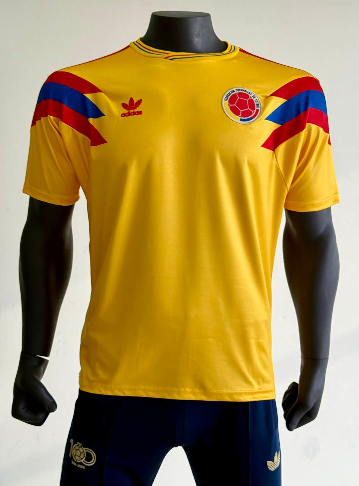 El diseño evoca claramente la época dorada del fútbol colombiano de los años 90, cuando Carlos “El Pibe” Valderrama brillaba por su talento y su icónica melena rubia. Es una prenda que combina nostalgia, elegancia deportiva y orgullo nacional.