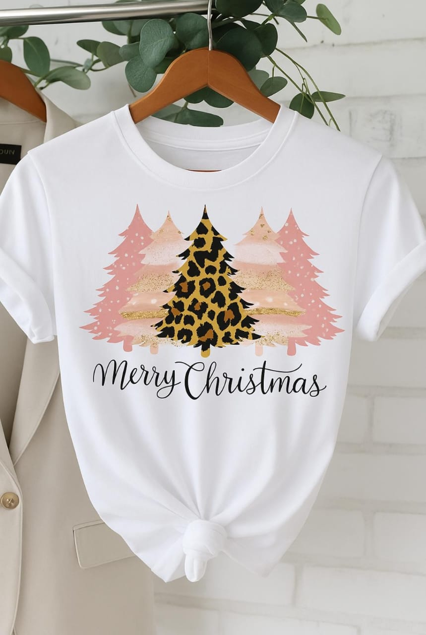 Camiseta cuello redondo clásico, mangas cortas con estilo casual, tela lijera que aparenta ser fresca y cómoda. con a nudo en la parte frontal. creando un efecto ajustado. Su estampado es navideño combinado con colores pasteles, dando un toque mas delicado.