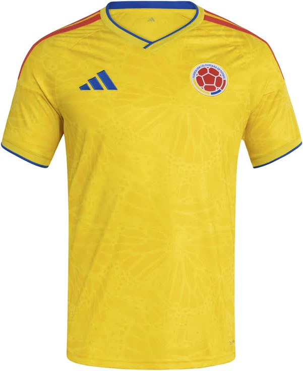Escudo de la Federación Colombiana de Fútbol bordado en el pecho izquierdo con colores definidos y buen nivel de detalle.