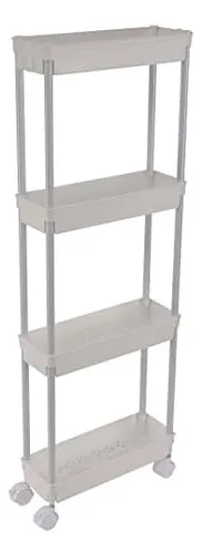 Un carrito organizador delgado de 4 niveles de plástico es una solución espacio-ahorradora para ordenar objetos sin ocupar mucho piso. Su estructura suele estar hecha de plástico resistente y liviano, a veces con barras metálicas de refuerzo, lo que lo hace fácil de limpiar y mover.