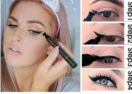 Hermoso delineador con plumón y punta de sello para lograr la Mirada Cat Eye, con dos puntas : una es plumón grueso para marcar la línea de tu ojo y la Otra punta es un sello para crear el delineado Cat Eye.