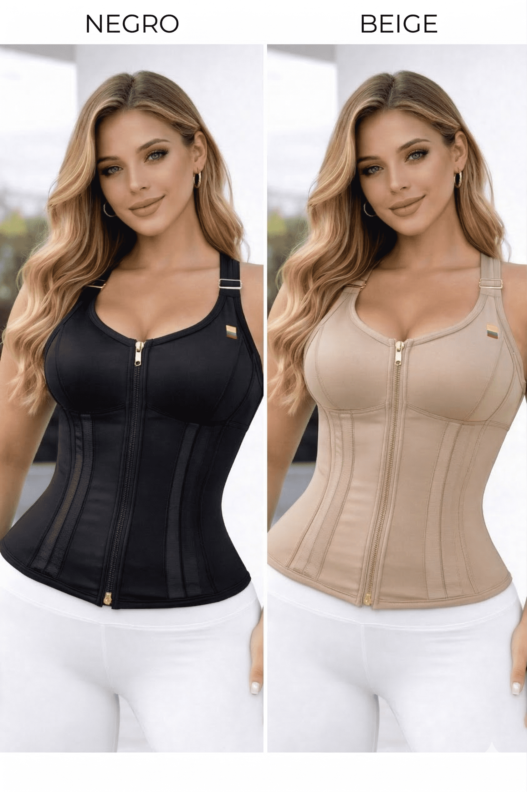 Cierre Reforzado: Broches internos y cremallera frontal para máxima discreción bajo la ropa.