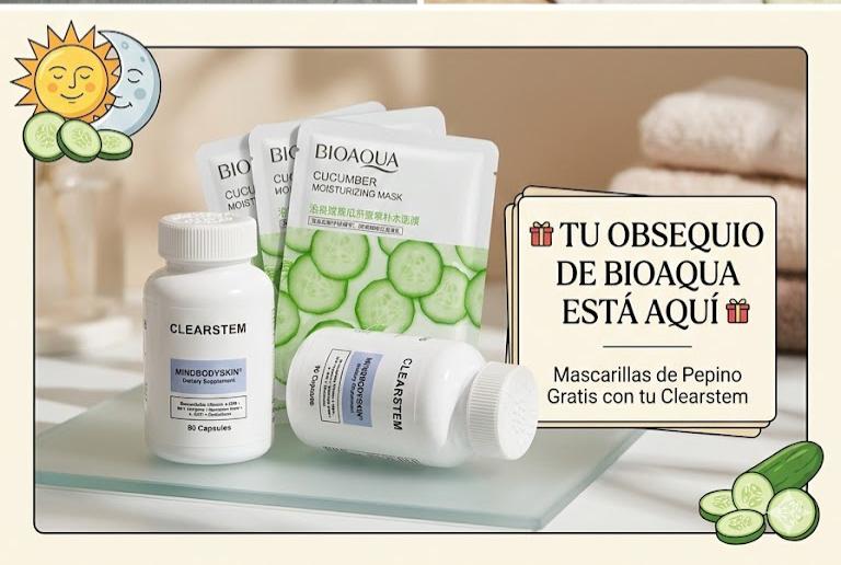 Clearstem es el suplemento estrella, con obsequio mascarilla de pepino que tus clientes están buscando. Su fórmula está diseñada para apoyar el bienestar y el equilibrio del organismo desde adentro, posicionándolo como un verdadero producto ganador dentro de cualquier tienda.