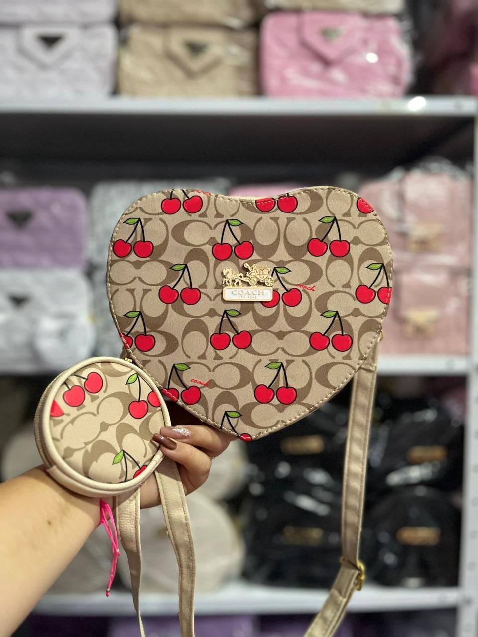 Diseño de la tela: Monograma de la marca con estampado de cerezas.