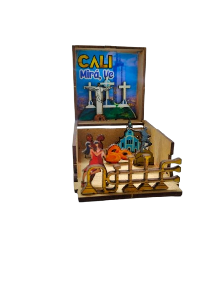 Descripción del Producto: Souvenir decorativo tipo caja escénica de la ciudad de Cali, Colombia. Fabricado con corte láser de precisión y ensamblado a mano para crear un efecto de profundidad único.