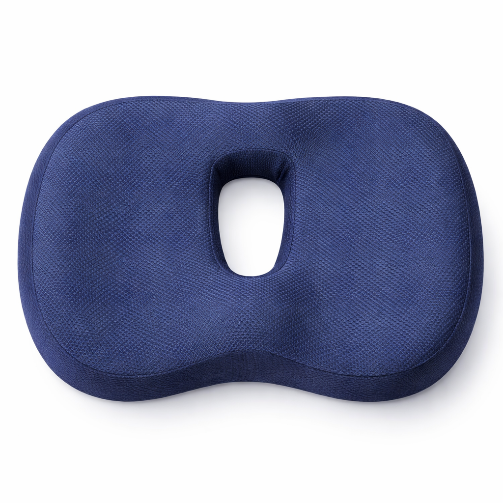 Es un cojín ergonómico diseñado para colocar sobre la silla y brindar mayor comodidad al sentarse. Su diseño con abertura central ayuda a liberar la presión en la zona del coxis y mejorar la postura al permanecer sentado.
