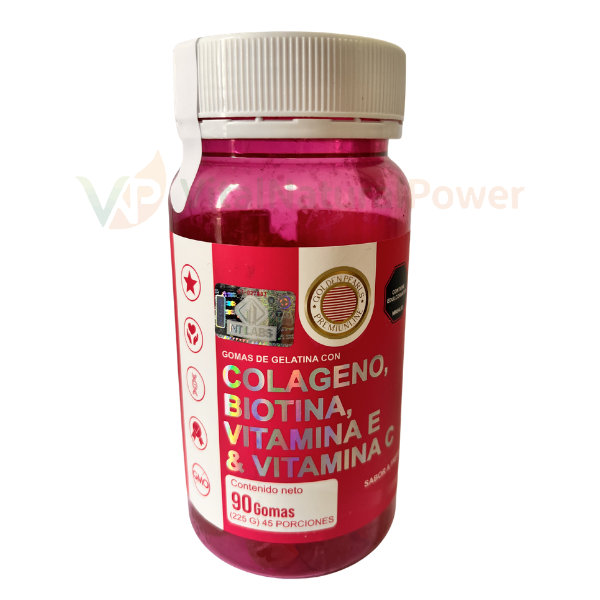 Ingredientes Destacados: Colágeno hidrolizado, Biotina, Ácido Ascórbico (Vit. C), Acetato de Tocoferol (Vit. E), base de gelatina, sabor idéntico al natural a fresa premium y color natural.