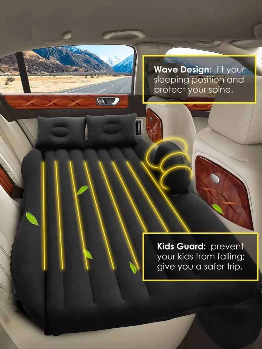 Material de PVC suave de alta calidad y diseño ondulado, proporciona un ambiente cómodo durante el viaje y el sueño en el coche, transformando el asiento trasero en una cama cómoda y lujosa. Con un bloque de seguridad que evita que los niños caigan en el hueco entre los asientos delanteros. El flujo interno puede bloquearse eficazmente en la parte inferior del ruido del vehículo, garantizando un ambiente tranquilo para dormir. Durable y fuerte, capacidad de carga hasta 150 kg, permite el uso de 2 adultos. Una bomba eléctrica que se conecta a la toma del encendedor del coche proporciona una inflación rápida y fácil. Compatible con la mayoría de los coches, sedanes, SUV y mini Van. Adecuado para viajes de larga distancia, camping, aventuras, etc.