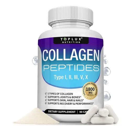 Collagen Peptides Toplux con 5 tipos de colágeno (I, II, III, V y X) que apoyan la salud de la piel, cabello, uñas, articulaciones y huesos. Su fórmula ayuda a mejorar la elasticidad de la piel, fortalecer las articulaciones y contribuir a la recuperación del cuerpo. Presentación de 90 cápsulas, ideal para el bienestar diario.