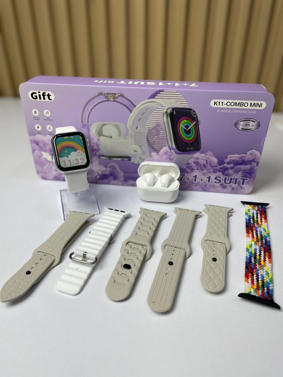 El K11-COMBO es un set tecnológico compacto que combina estilo, conectividad y funcionalidad en un solo paquete. Incluye un Smartwatch de 41 mm con caja de aluminio y un par de audífonos inalámbricos con estuche de carga, todo presentado en un elegante empaque ideal para regalo.
