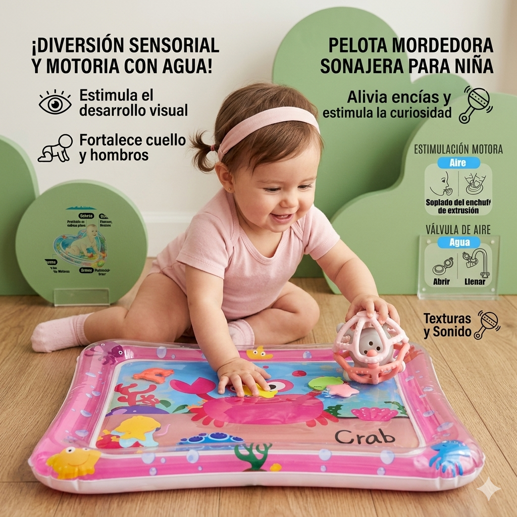 Producto es un tapete de estimulación sensorial para bebés (tummy time mat) diseñado para usar con agua.