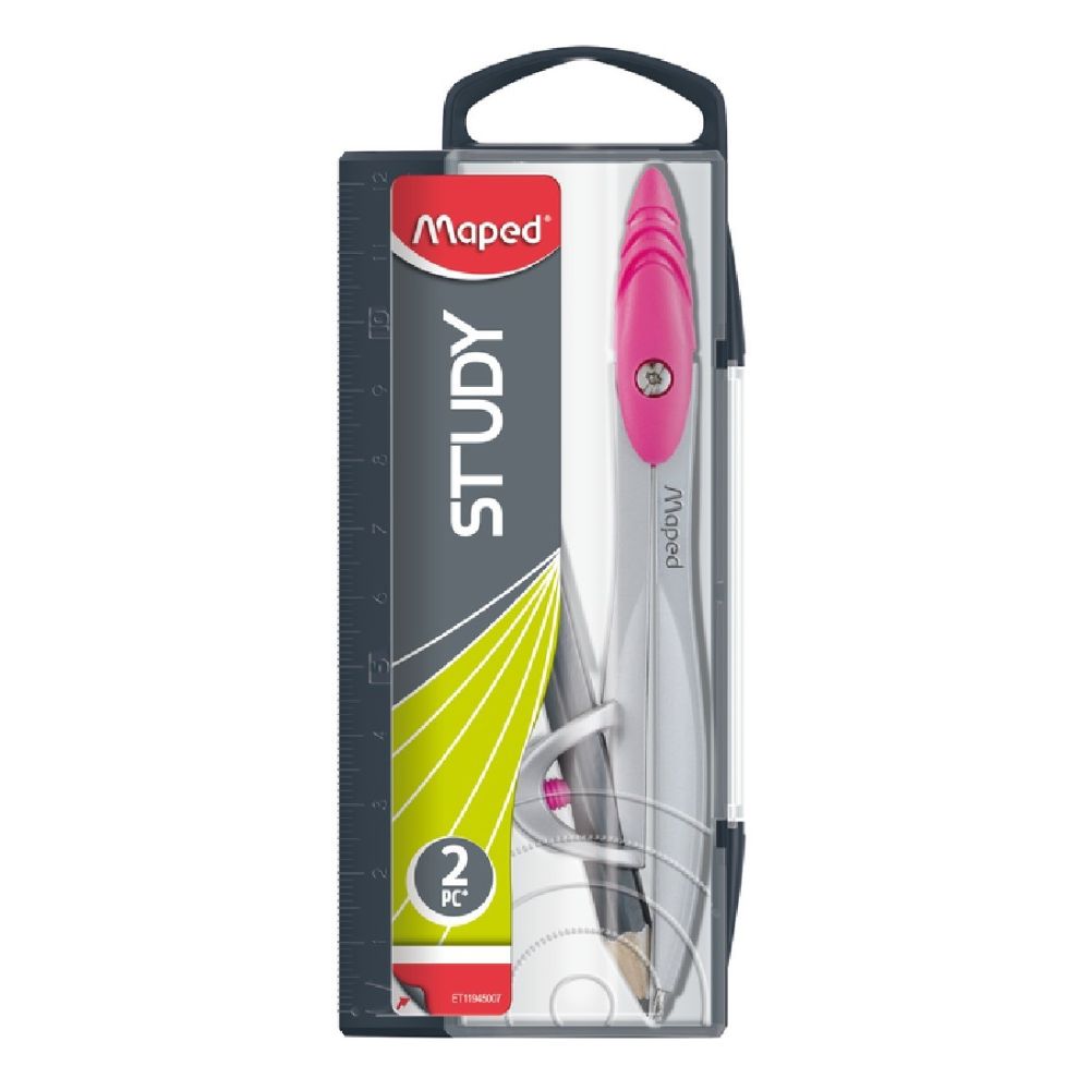 Las imagenes son referencias y pueden variar segun disponibilidad. Este compas Maped Study metal incluye lapiz adicional, diseñado para ejercicios de geometria y dibujo tecnico en el entorno escolar. Su estructura metalica permite ajuste firme y apertura regulable, facilitando circunferencias definidas y trabajo preciso en cuadernos y laminas academicas.