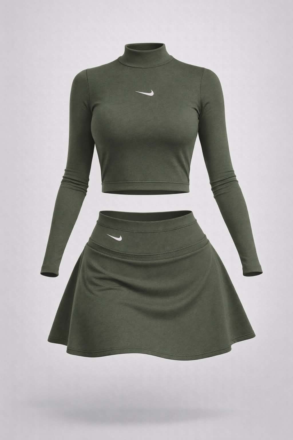 El buso manga larga con cuello alto ofrece mayor cobertura y un diseño moderno, mientras que la falda short aporta seguridad y comodidad para cualquier actividad.