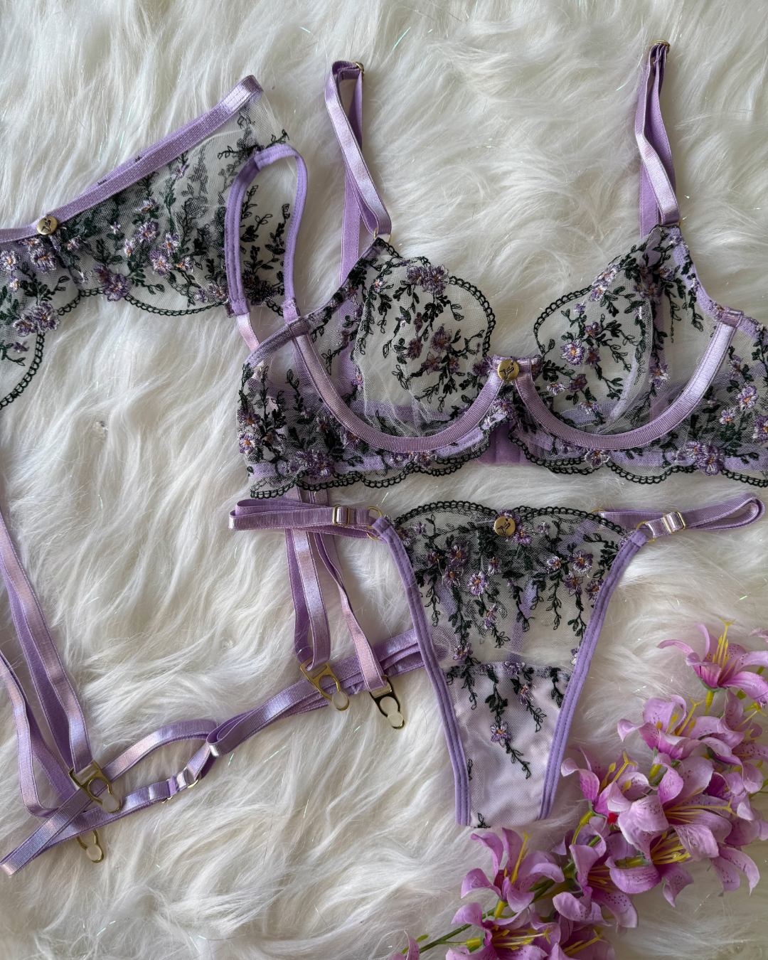 El conjunto incluye panty en tul bordado con laterales graduables, que se adapta suavemente a la figura, y un liguero a juego con ligas para las piernas, aportando un toque sensual y sofisticado.