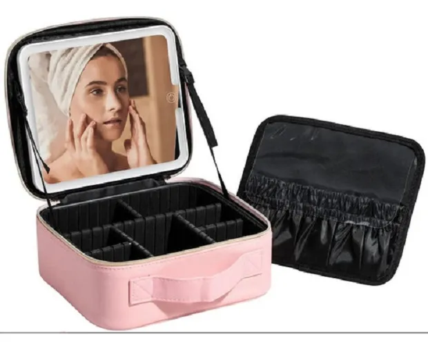 ESTUCHE MAQUILLAJE INTELIGENTE ESPEJO LUZ LED PORTÁTIL 1. Gran Capacidad y Materiales de Alta Calidad Esta bolsa de maquillaje de viaje está fabricada en piel sintética, lo que la hace impermeable y fácil de limpiar. Su forro de fibra de carbono mejora tanto la estética como la durabilidad. Equipada con un espejo LED de 3 colores, fabricado con materiales de primera calidad y diseño ergonómico, es ideal para viajes o negocios. Su transporte es sencillo y sin esfuerzo. 2. Espejo de Luz de Relleno Inteligente de Tres Colores El espejo incluye una función de memoria para la intensidad de la luz y es completamente ajustable. • Interru ptor táctil para seleccionar entre luz fría, natural o cálida, realzando los detalles de tu piel. • Control de brillo manteniendo pulsado el interruptor. • Batería de 1500 mAh para una larga duración sin preocupaciones. 3. Caja de Almacenamiento Desmontable El estuche de maquillaje incluye seis particiones de desmontables y resistentes a los golpes, permitiéndote organizar tu espacio según el tamaño de tus cosméticos. Protege tu maquillaje de daños o fugas, y la bolsa para brochas separada garantiza su limpieza y orden. 4. Nuevo Diseño y Mejoras Este modelo viene con una cremallera suave en forma de gota de agua, facilitando la apertura. El mango ha sido rediseñado para mayor ergonomía y reducir la presión. 5. Regalo Ideal No solo obtienes una bolsa de maquillaje de alta calidad, también es un regalo perfecto.