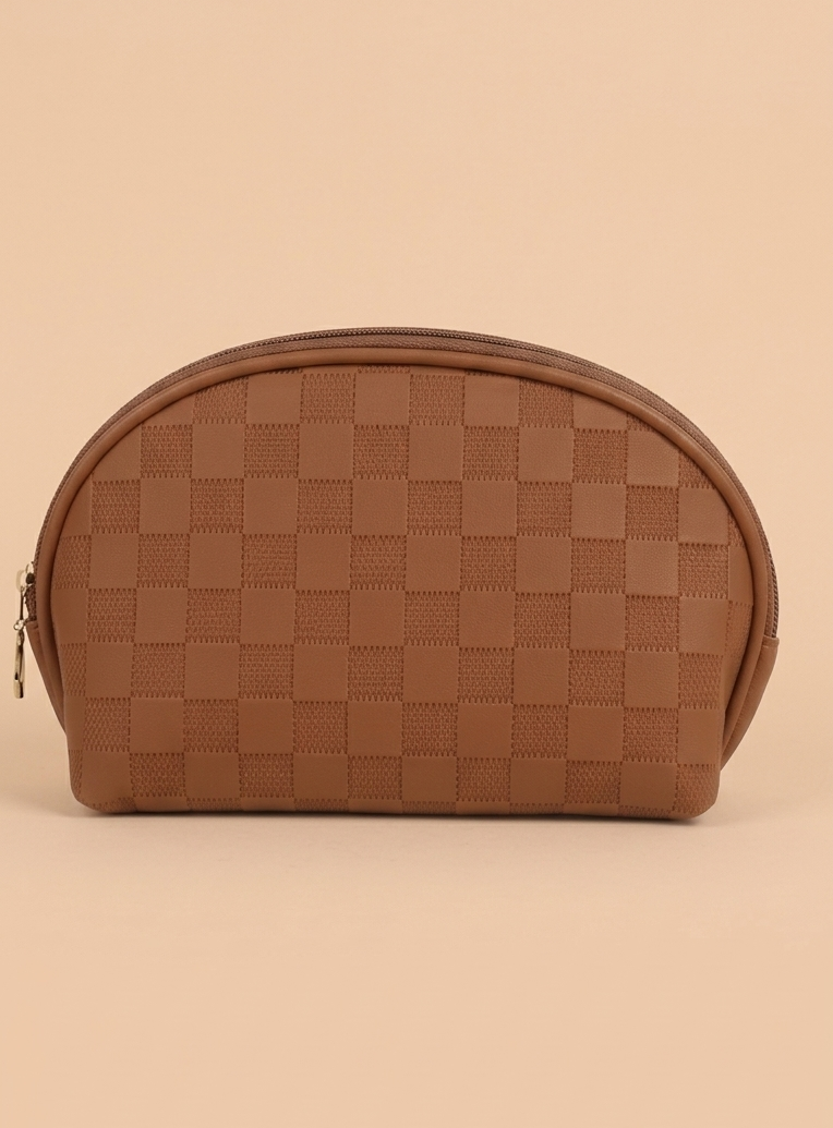 Cosmetiquera con silueta de media luna y acabado texturizado en patrón de cuadros (checkered), que combina elegancia y funcionalidad para el uso diario. Su diseño estructurado pero flexible permite un almacenamiento eficiente de cosméticos esenciales, mientras que su cierre metálico garantiza seguridad y durabilidad.