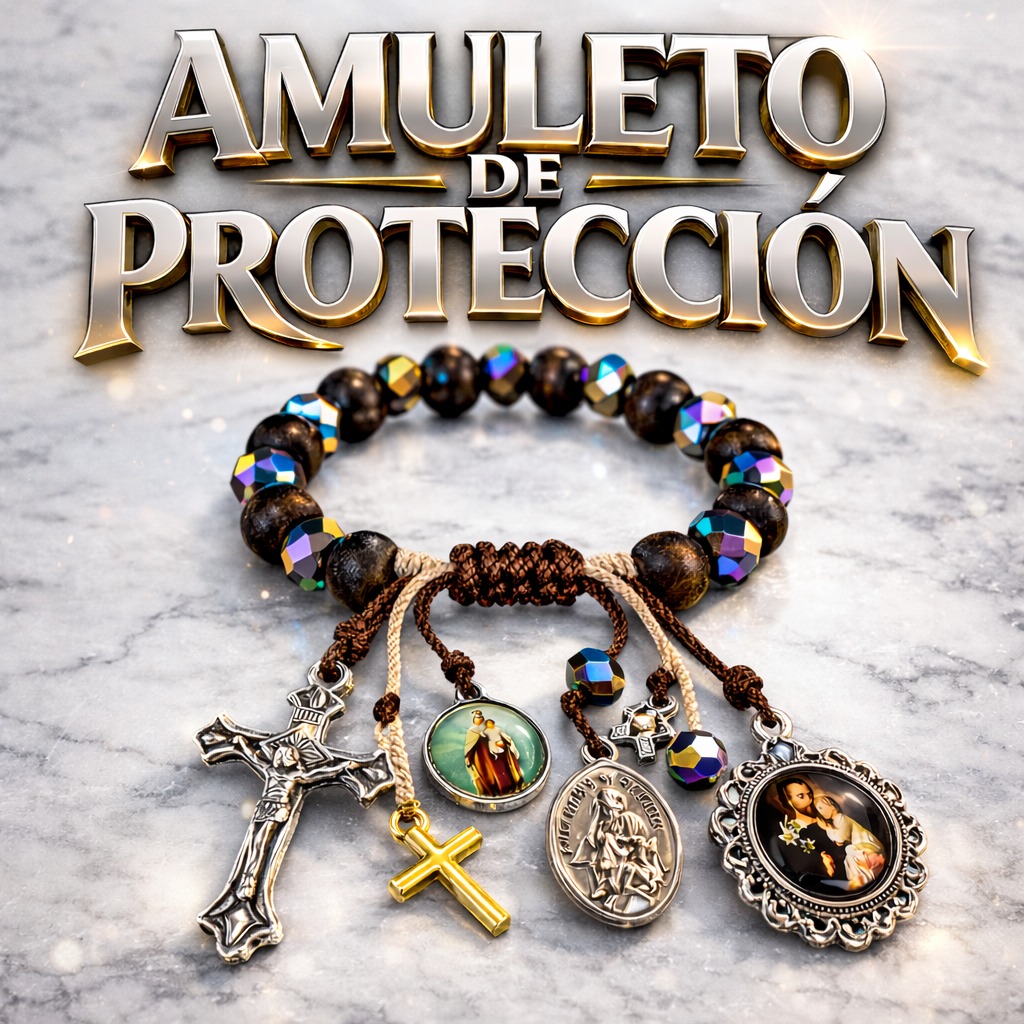 Decenario de protección elaborado con cuentas finas de acabado brillante y detalles metálicos de alta calidad. Cada pieza incluye dijes finos cuidadosamente trabajados, que representan símbolos de fe, protección y buena energía.