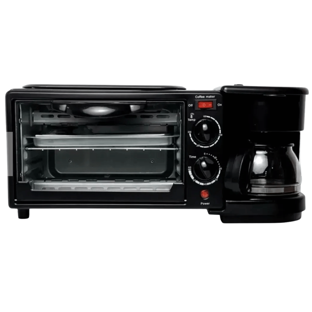 Desayunador eléctrico multifunción diseñado para preparar diferentes alimentos del desayuno en un solo equipo. Su estructura integra horno tostador y cafetera, permitiendo optimizar el tiempo mientras se preparan bebidas calientes y alimentos al mismo tiempo.