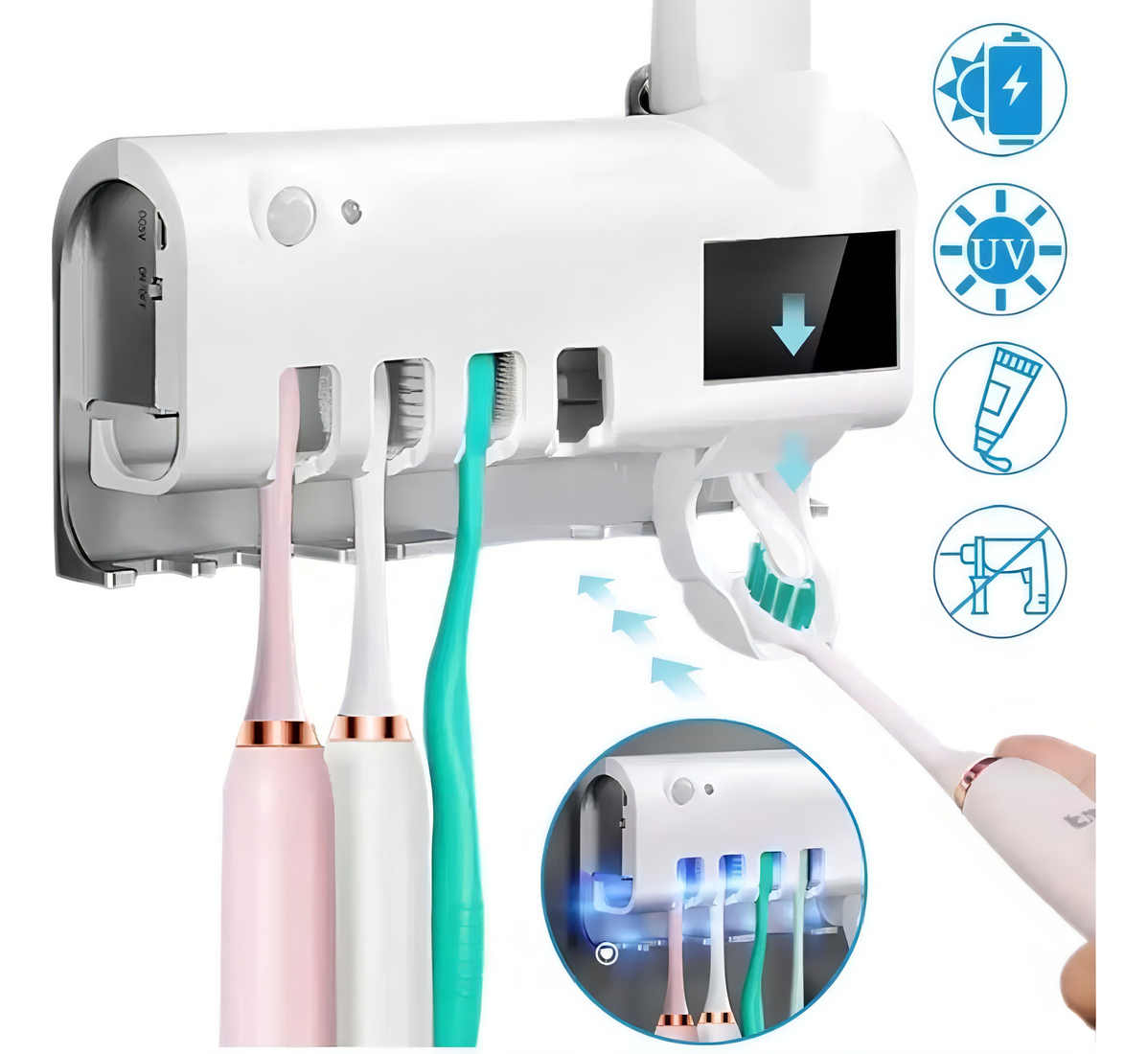 Beneficios principales Dosifica sin desperdicio, organiza hasta 4 cepillos, montaje en pared sin perforar y esterilización UV automática/recargable para mayor higiene.
