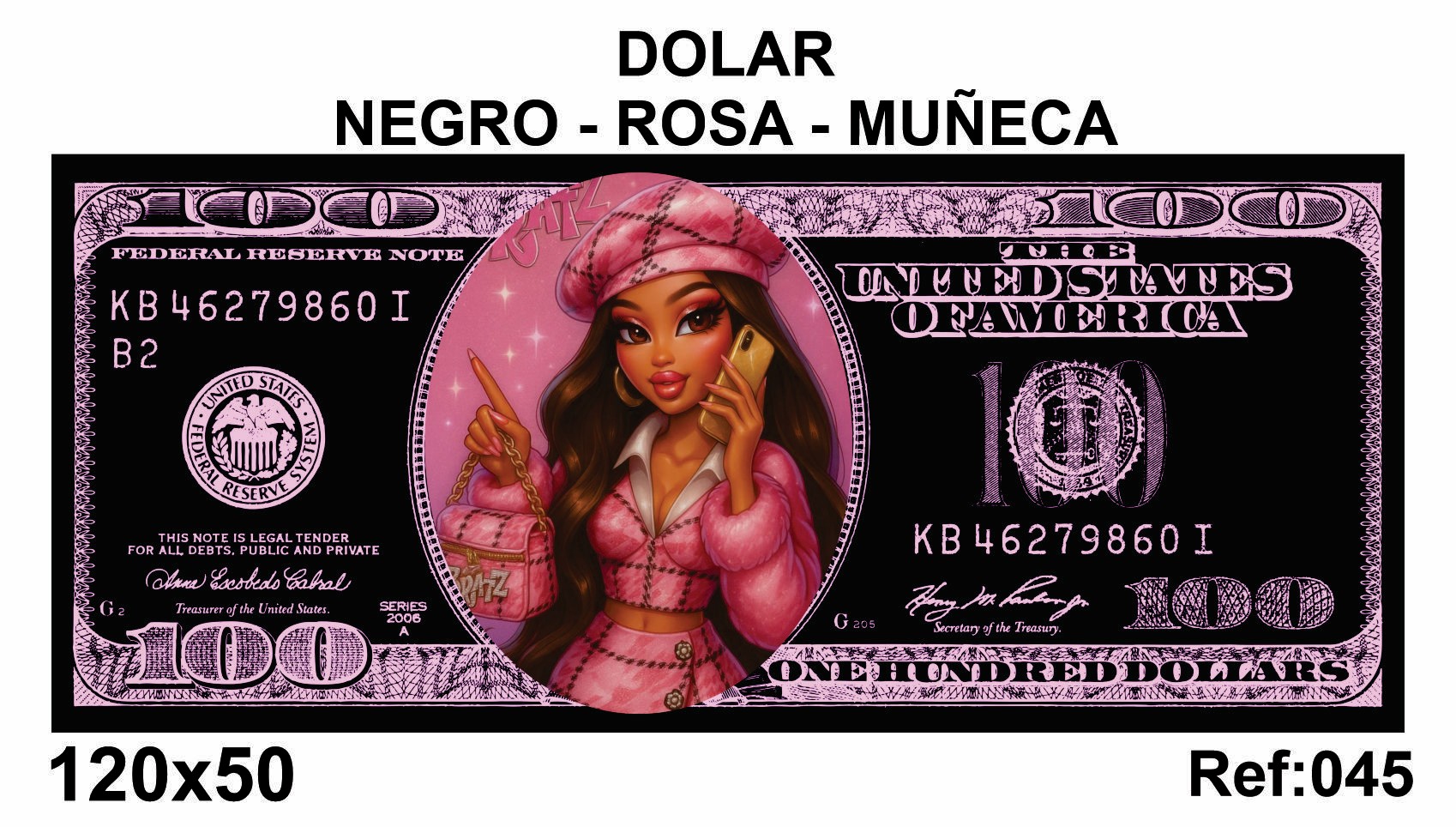 🖼️ DÓLAR NEGRO-ROSA-MUÑECA– 120x50 cm