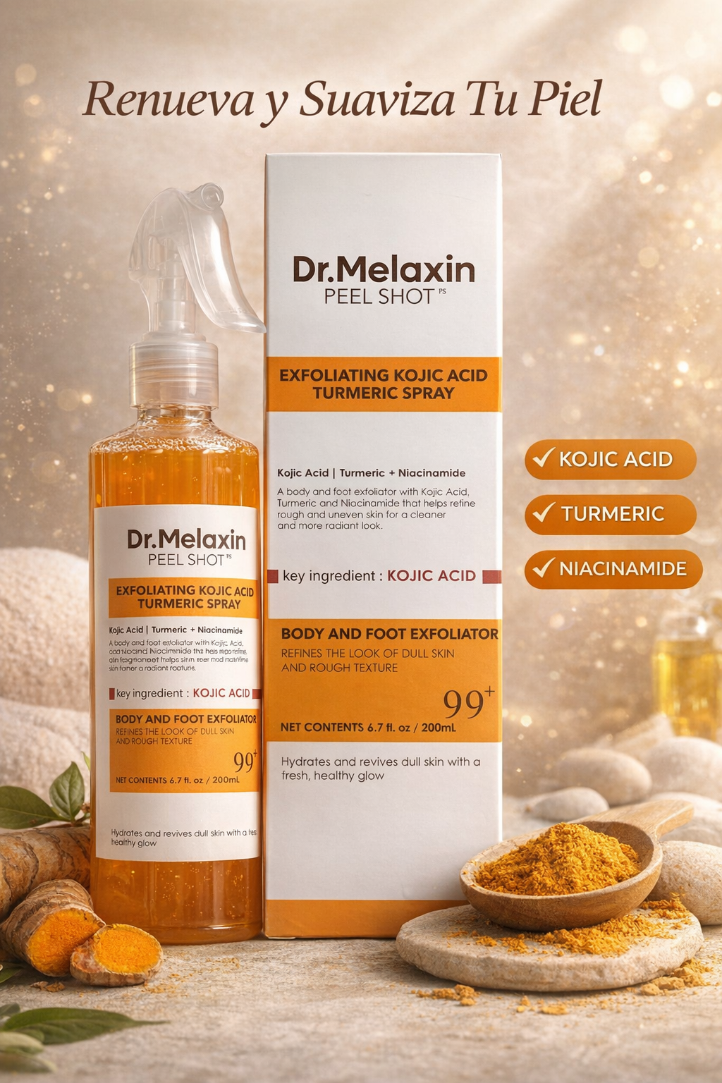 Renueva tu piel y revela un tono más luminoso con este potente exfoliante corporal que combina ácido kójico y cúrcuma, dos ingredientes reconocidos por sus propiedades iluminadoras, despigmentantes y antioxidantes.