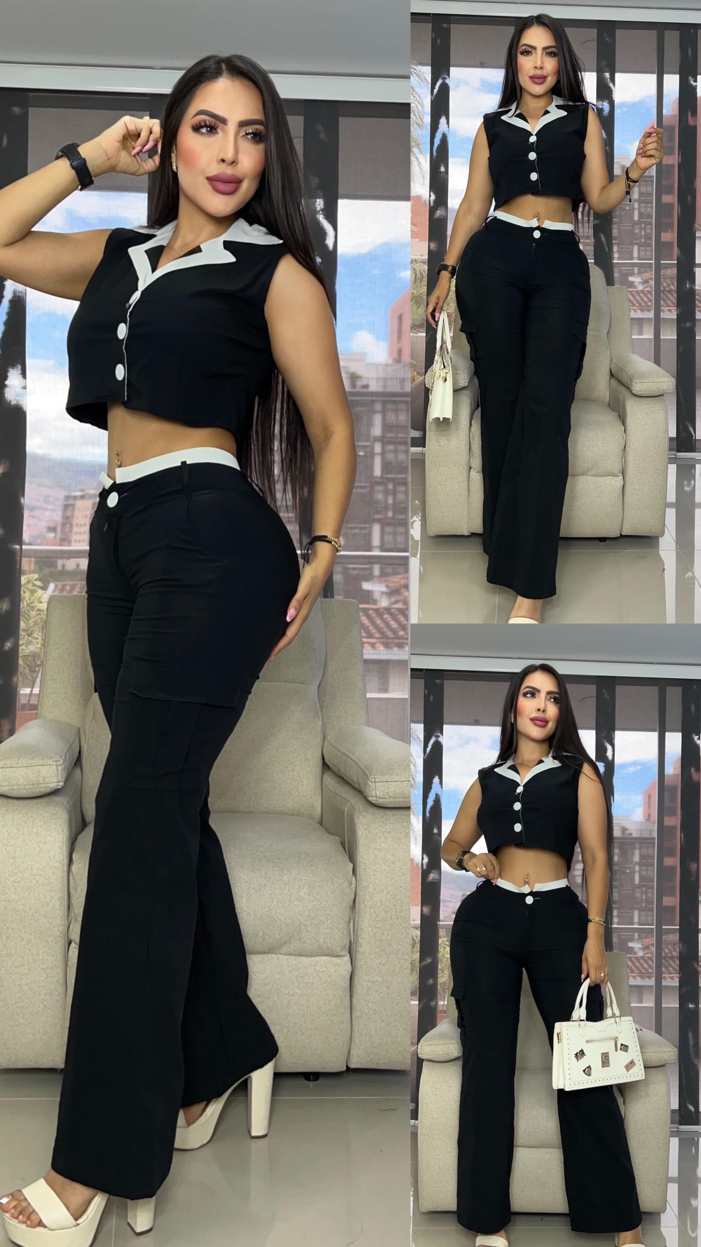 Lleva tu estilo al siguiente nivel con este conjunto de dos piezas . El crop top tipo chaleco con cuello camisero y botones frontales aporta un aire estructurado, pantalon cargo de tiro alto con detalle de pretina blanca estilizan tu figura.