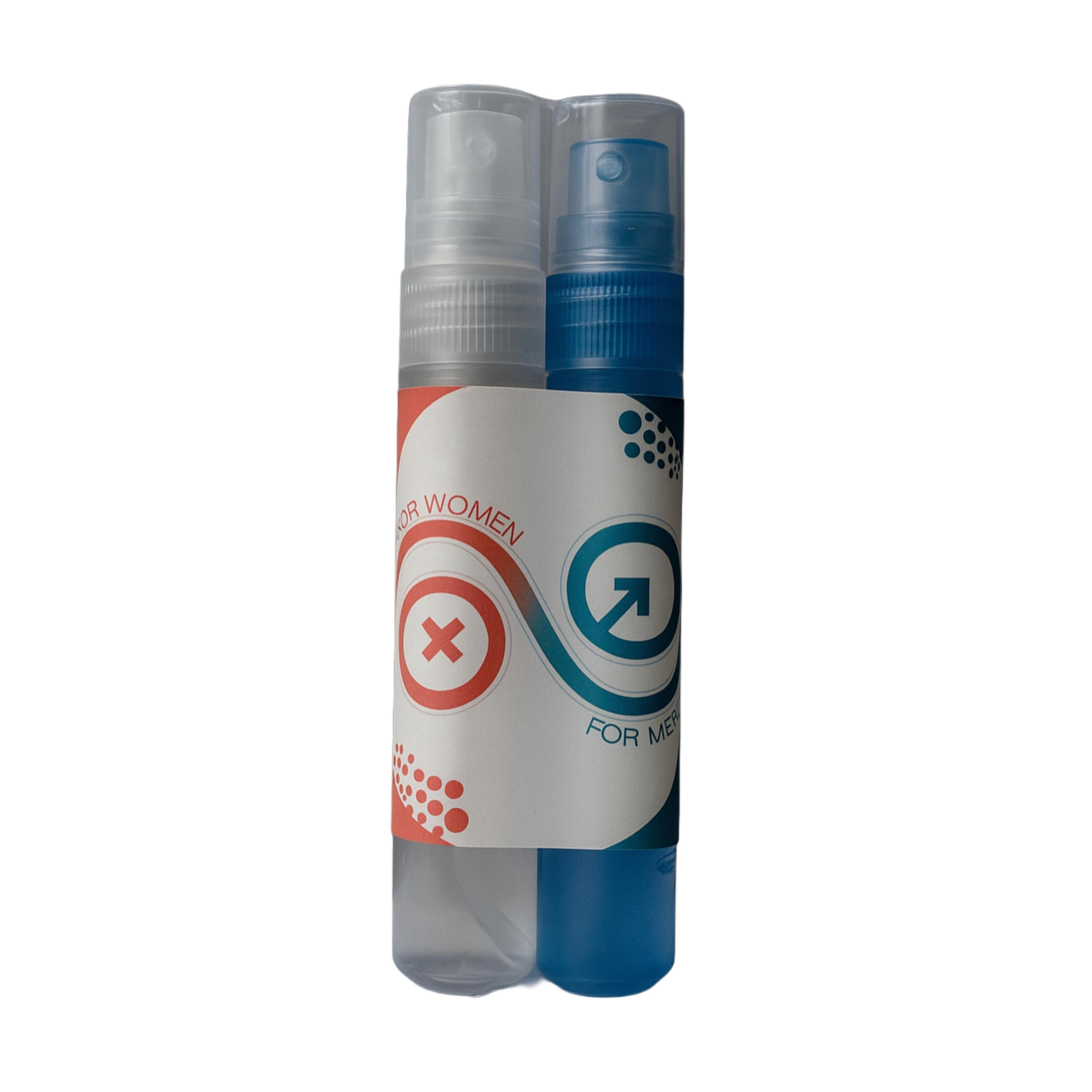 Incluye dos sprays de 15ml que se complementan perfectamente: uno enfocado en el control masculino y otro en la sensibilidad femenina.